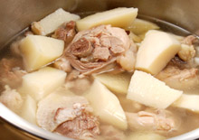 - 中空鍋中放入半鍋水,以中火煮滾加入雞腿、竹筍、薑片、塩。