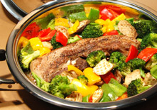 - 待鍋邊冒水蒸氣,將五花肉翻面,再將杏鮑菇及甜椒放入,蓋上鍋蓋第二次冒水蒸氣蔬菜都可先起鍋,五花肉可切片,再烤一下更酥脆。