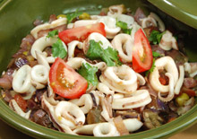 紫洋蔥1顆、西洋芹1根、茄子1條、蕃茄1顆、大蒜2瓣、橄欖油、醃製橄欖10個(無可不加)、花枝2支或旗魚片2片(以魚肉為主)